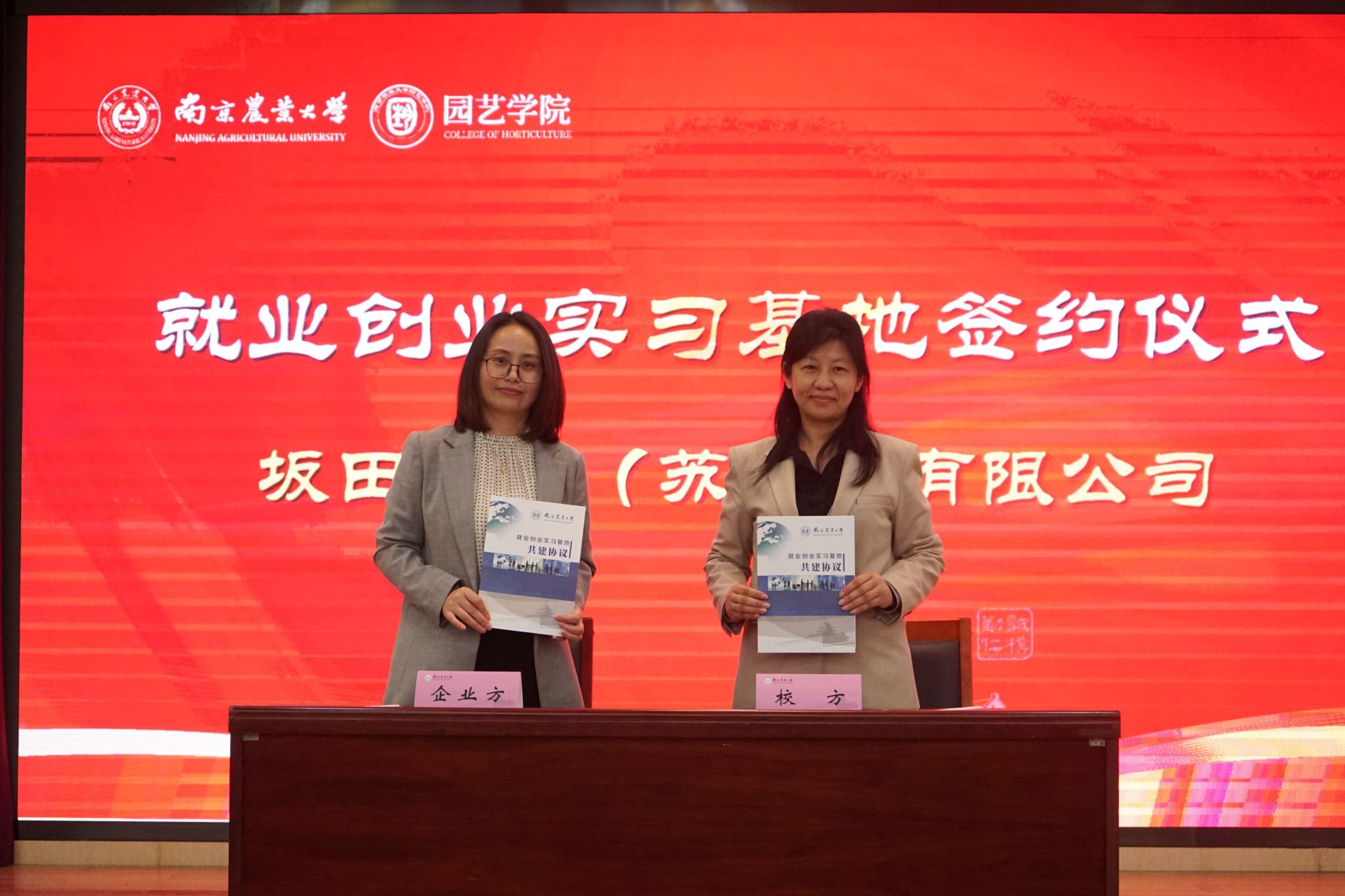 与江苏百绿园林集团有限公司、坂田种苗(苏州)有限公司、缤纷园艺(中国)有限公司、南京拙景园林规划工程有限公司、南京耐特菲姆农业科技有限公司、上海深圳奥雅园林设计有限公司、大连毅都集团有限公司完成就业创业基地签约仪式,为后续校企平台搭建、就业资源整合开启新的篇章。