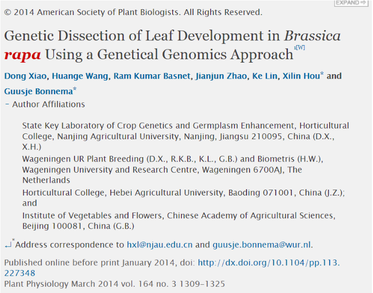 白菜系统生物学实验室与荷兰瓦赫宁根大学(Wageningen University)植物育种系合作完成的研究论文"Genetic dissection of leaf development in Brassica rapa using a genetical genomics approach"在《Plant Physiology》上发表,影响因子为6.555。肖栋博士为第一作者,侯喜林教授与Guusje Bonnema教授为共同通讯作者,91探花