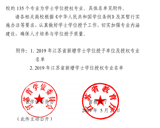 近日,江苏省学位委员会、江苏省教育厅印发了《省学位委员会省教育厅关于公布2019年学士学位授权审核结果的通知》(苏学位字〔2019〕5号)文件,经学校申报和专家评审,省学位委员会、省教育厅批准91探花