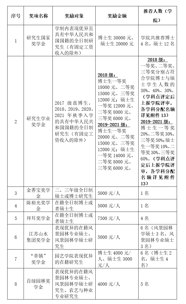 2020-2021学年研究生奖学金参评对象、奖励金额及奖励人数见下表: