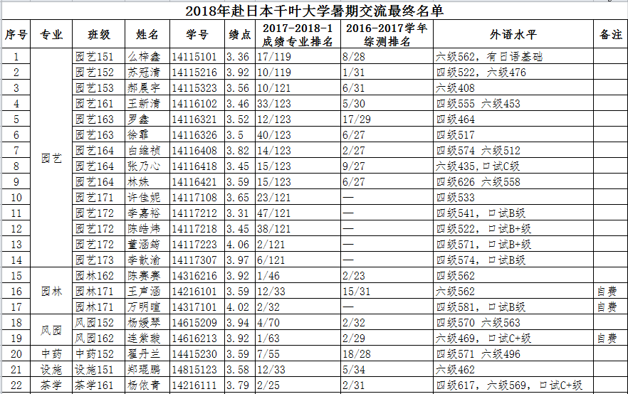 经个人申请、学院集中评审,拟推荐以下学生参加2018年暑期日本千叶大学访学项目并获得一定金额的项目资助,现将名单公示如下,如有异议,请于2018年6月10日前反映至生科楼B4010夏老师处,联系电话:025-84395075。