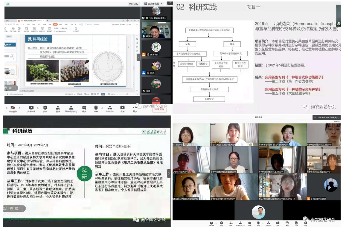 副院长、观赏园艺学学科点点长陈素梅,园艺系系主任上官凌飞,茶学系系主任陈暄,设施农业科学与工程系系主任束胜,导师代表高志红,研究生辅导员芮伟康,以及经过层层选拔、来自全国各地54所高校的共170名本科生通过网络相聚云端,参加了论坛的开幕式。开幕式由学院党委副书记文习成主持。