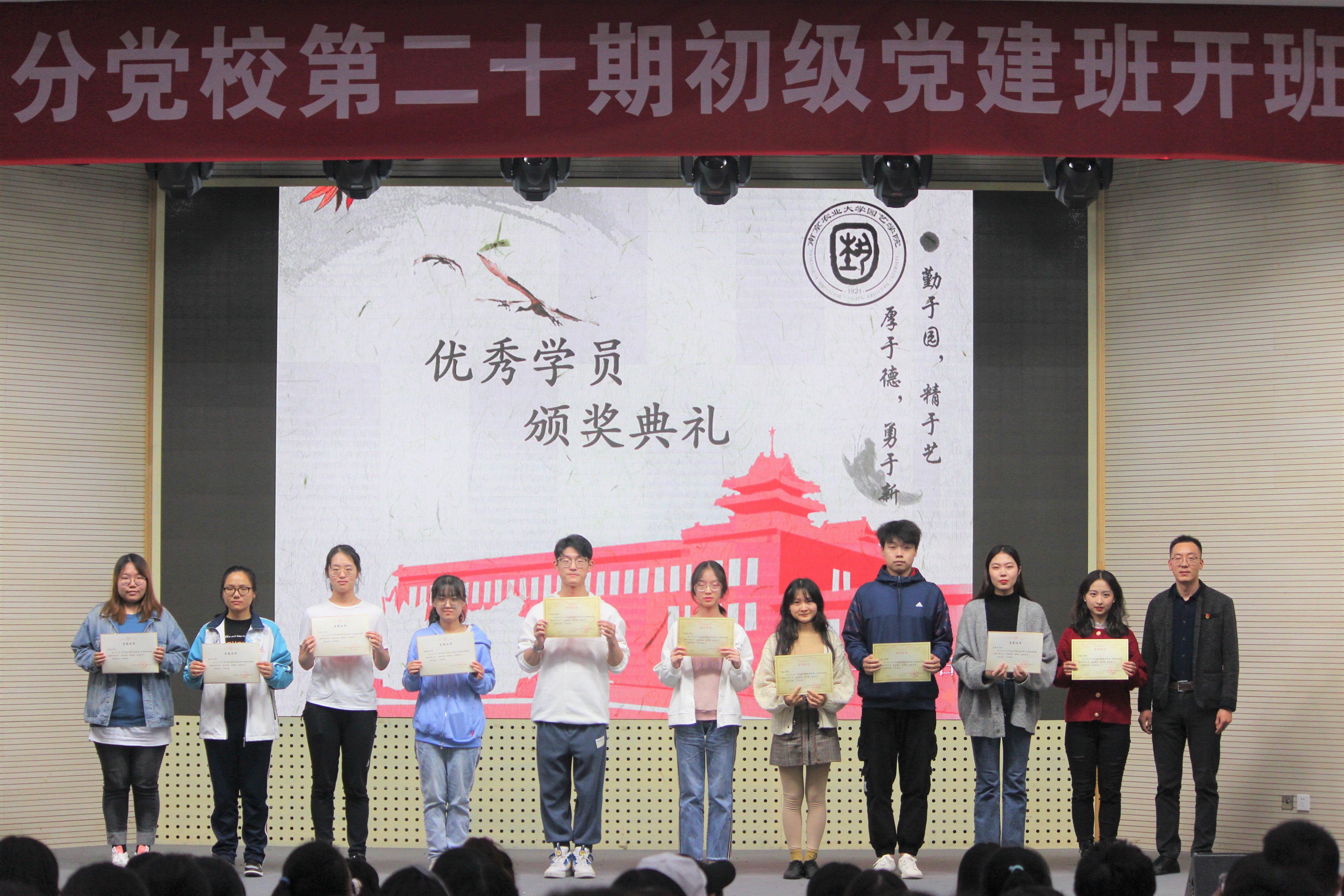 典礼在雄壮的国歌声中正式开始。首先文习成宣读第十九期初级党建班优秀学员表彰决定,为优秀学员颁发证书并由优秀学员代表刘可心进行发言。随后,李柯和窦靓分别介绍了本期党建班概况、课程计划和班级负责人及职责。本期初级党建班共招收学员369名,本科生246名,研究生123名。他们对初级党建班的同学提出要求,希望同学们通过分党校的培训,思想上、行动上更向党组织靠近,负责人也要充分发挥先锋模范作用。
