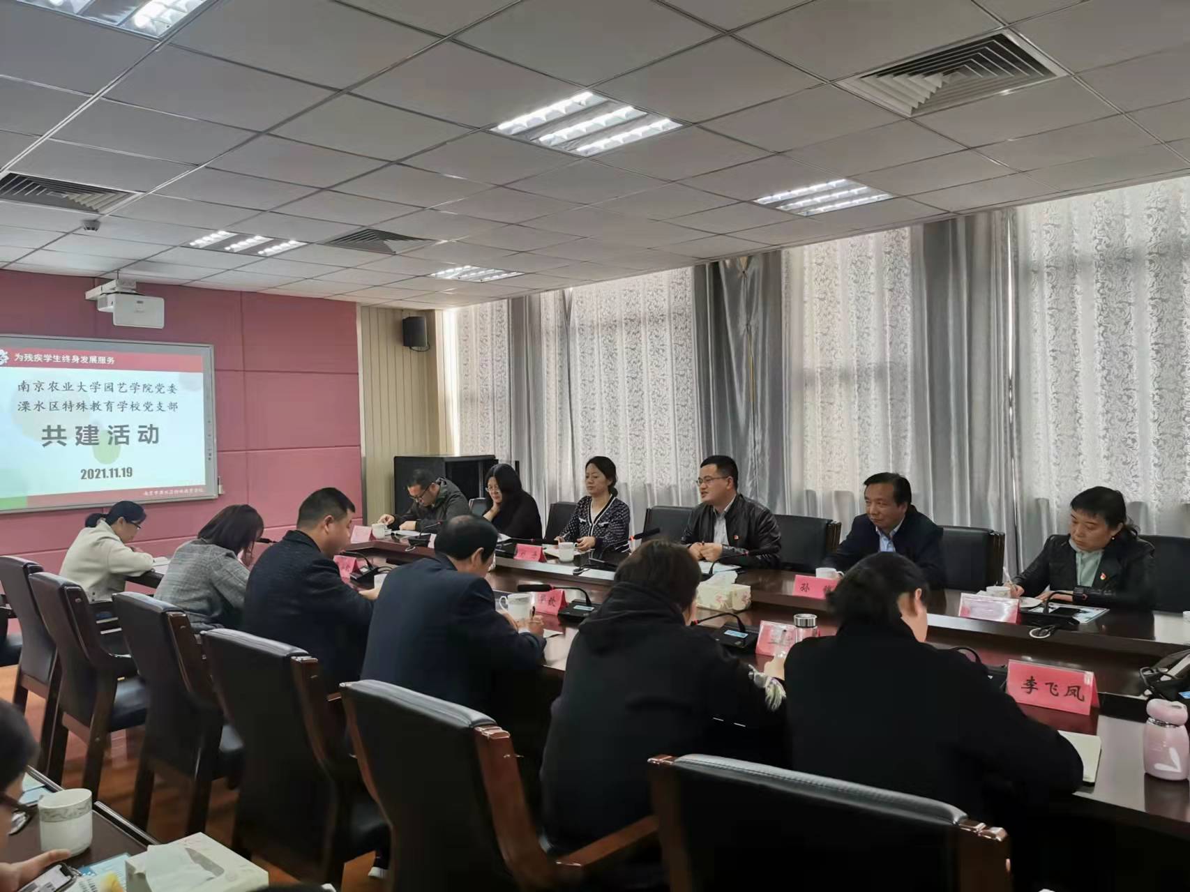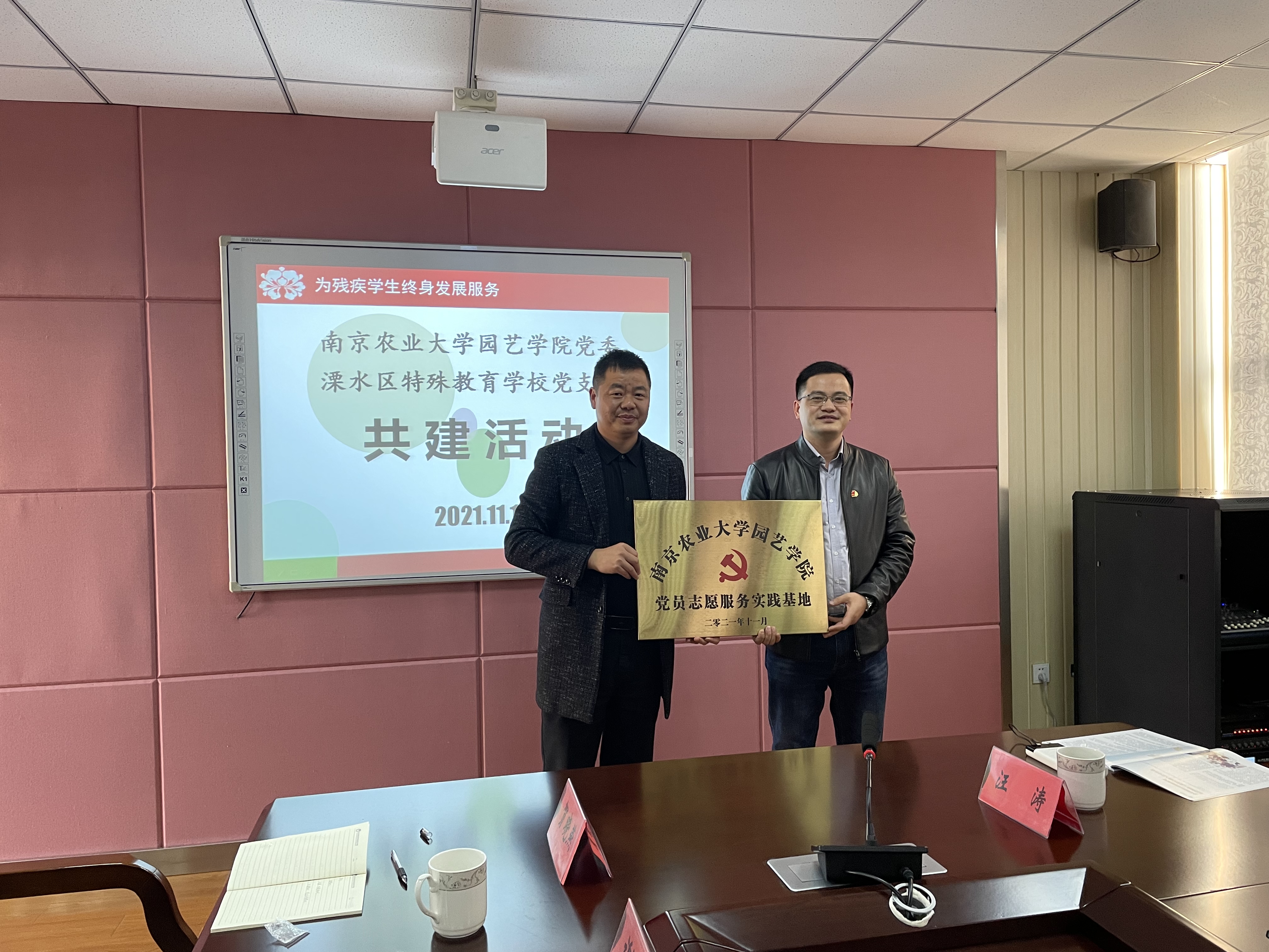 为进一步拓展学院党建工作新平台,搭建党员师生志愿服务新载体,扎实推进党史学习教育和“两在两同”建新功行动走深走实,2021年11月19日,学院党委书记韩键带领学院部分党委委员、党支部书记、支部委员一行33人赴溧水特殊教育学校开展党建共建活动,并举行党建共建授牌仪式。溧水特殊教育学校校长杨锦、原校长葛华钦、副校长王成琴以及部分老师参加共建授牌仪式。