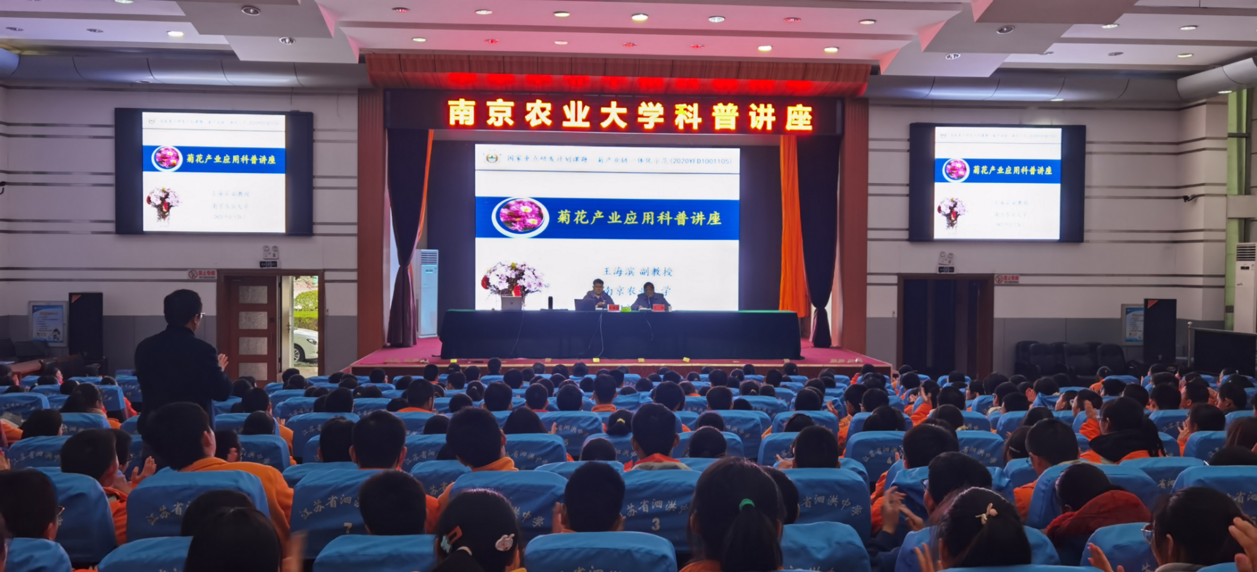 在泗洪中学,王海滨为700余名学生作了题为《菊花产业应用科普》的知识讲座。王老师从“采菊东篱下,悠然见南山”的菊花文化开始,讲述了菊花在花卉产业中的地位及观赏、药用、食用价值等,展示了各色菊花新品种,说到了91探花