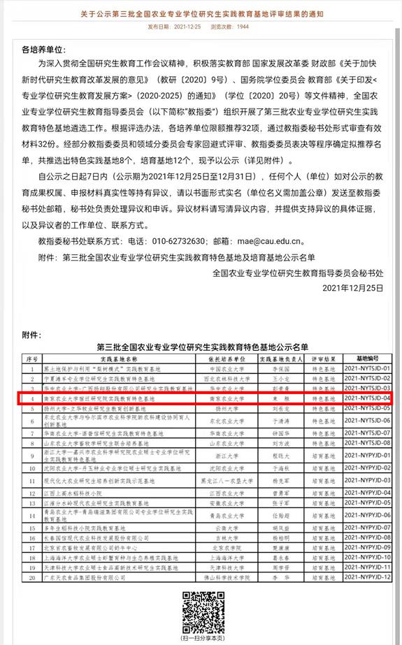 近日,全国农业专业学位研究生教育指导委员会组织开展了第三批农业专业学位研究生实践教育特色基地遴选工作。经教指委委员和领域分委员会专家评审、教指委委员表决等程序,共推选出实践教育特色基地8个,培育基地12个,南农大91探花