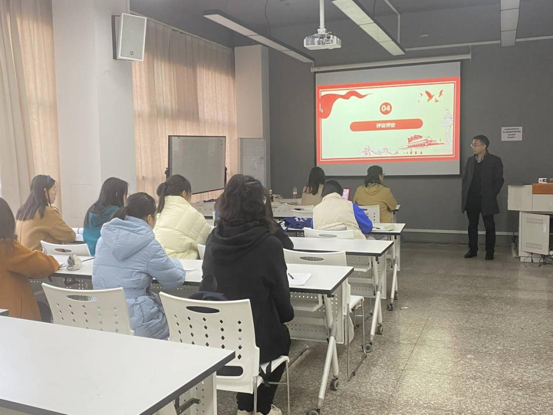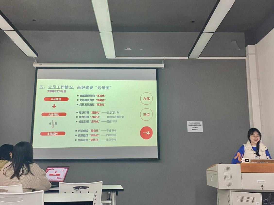 接着,鲁月进行2021年党支部工作述职。支部建设尊重学科专业属性,以规划设计次序为脉络阐述支部发展情况。支部通过调查问卷结果,分析了支部成员的思想和行为特征,明确了支部发展的愿景和框架,并通过老党员讲述、红色景观学习、党员交流会等方式促进了支部成员提升党性和专业本领。最后,她提出支部通过“三步走”发挥党员先锋作用的愿景。