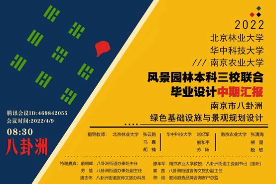 4月9日上午,由南京农业大学联合北京林业大学、华中科技大学共同参与的联合毕业设计“南京市八卦洲绿色基础设施与景观规划设计”中期汇报于线上顺利举行。来自三所院校的33位师生和南京八卦洲街道办事处主任余朝晖、街道工委副书记91探花