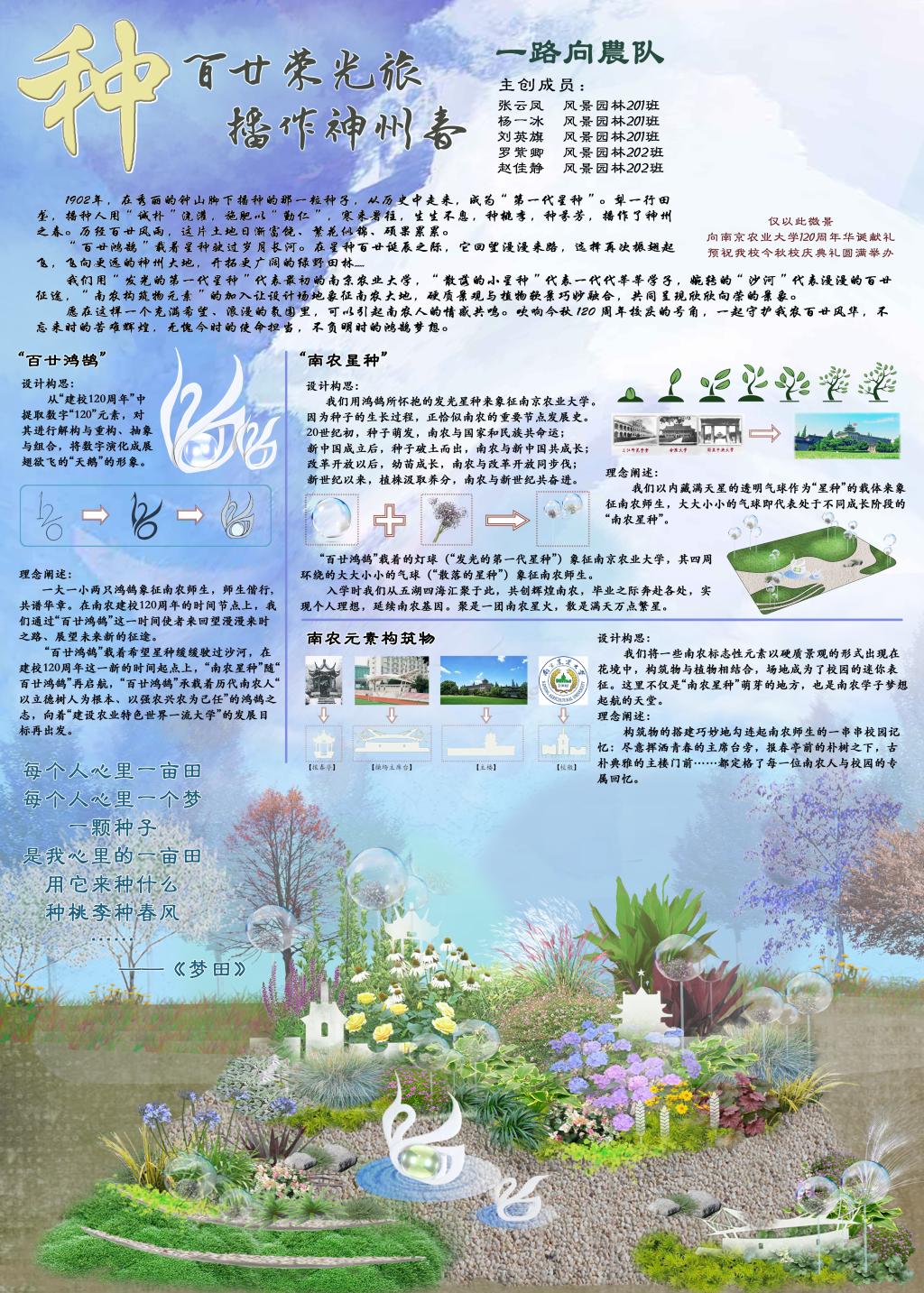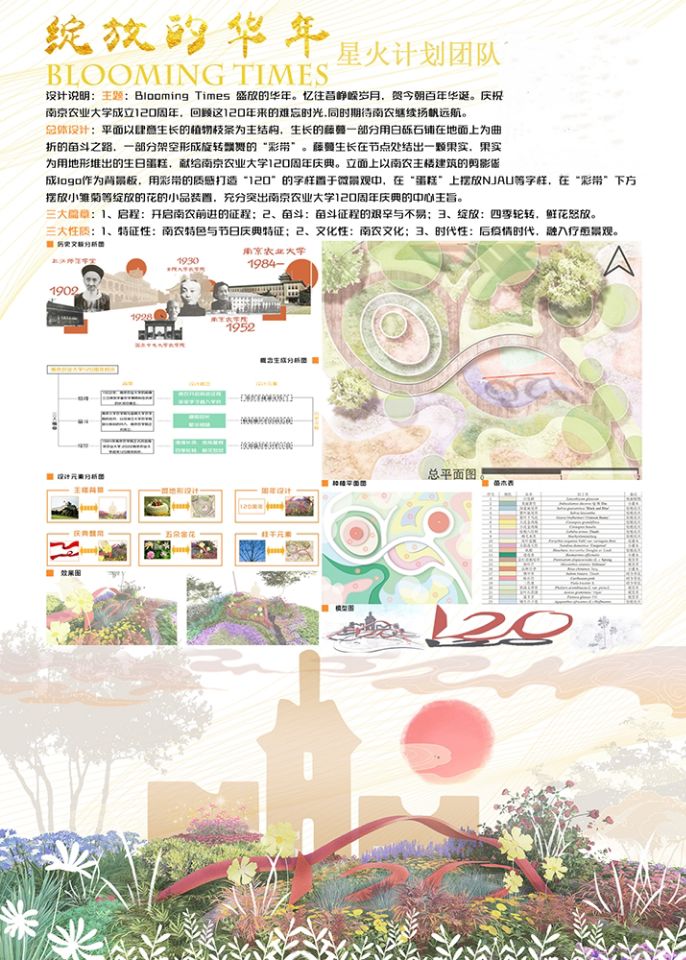 ,“散落小星种”代表一代代莘莘学子,婉转的“沙河”代表漫漫的百廿征途,“南农构筑物元素”的加入让设计场地象征南农大地,硬质景观与植物软景巧妙融合,共同呈现欣欣向荣的景象。