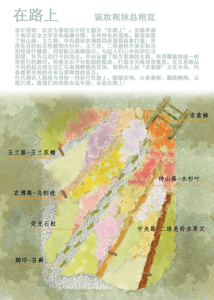 诞妆秾抹总相宜组的作品《在路上》,景观选取了钟山路、玉兰路、中央路和农博路四条道路具象打造,并用各自的标志性植物水杉叶、玉兰花、二球悬铃木果实和乌桕枝进行铺装,同时配以路牌提示,勾起人们心中的回忆与思绪,作为互动打卡的地点。中间设置了较为宽阔的主路,用苔藓装饰成一串串前行的脚印。用夜光石子勾勒路的痕迹,打造全天候观赏景观。在五条路从不同的起点相互交汇与高阔鲜艳的花海,倾斜向上的“求索梯”立在中央,代表着更光明的未来与更辉煌的远方。