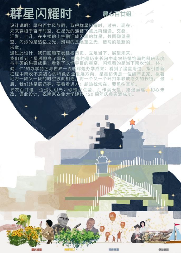秾心百廿组的作品《群星闪耀时》,通过回顾南农建校历史,看到星星用微弱的光照亮了黑夜,照亮的是历史长河中南农丰硕的科研成果,看到了永恒夺目的星空,闪烁着的是当下南农“诚、朴、勤、仁”的办学特色与世界一流的辉煌办学成果,看到了流星滑过,指引着新征程中南农不忘初心的特色农业发展方向。