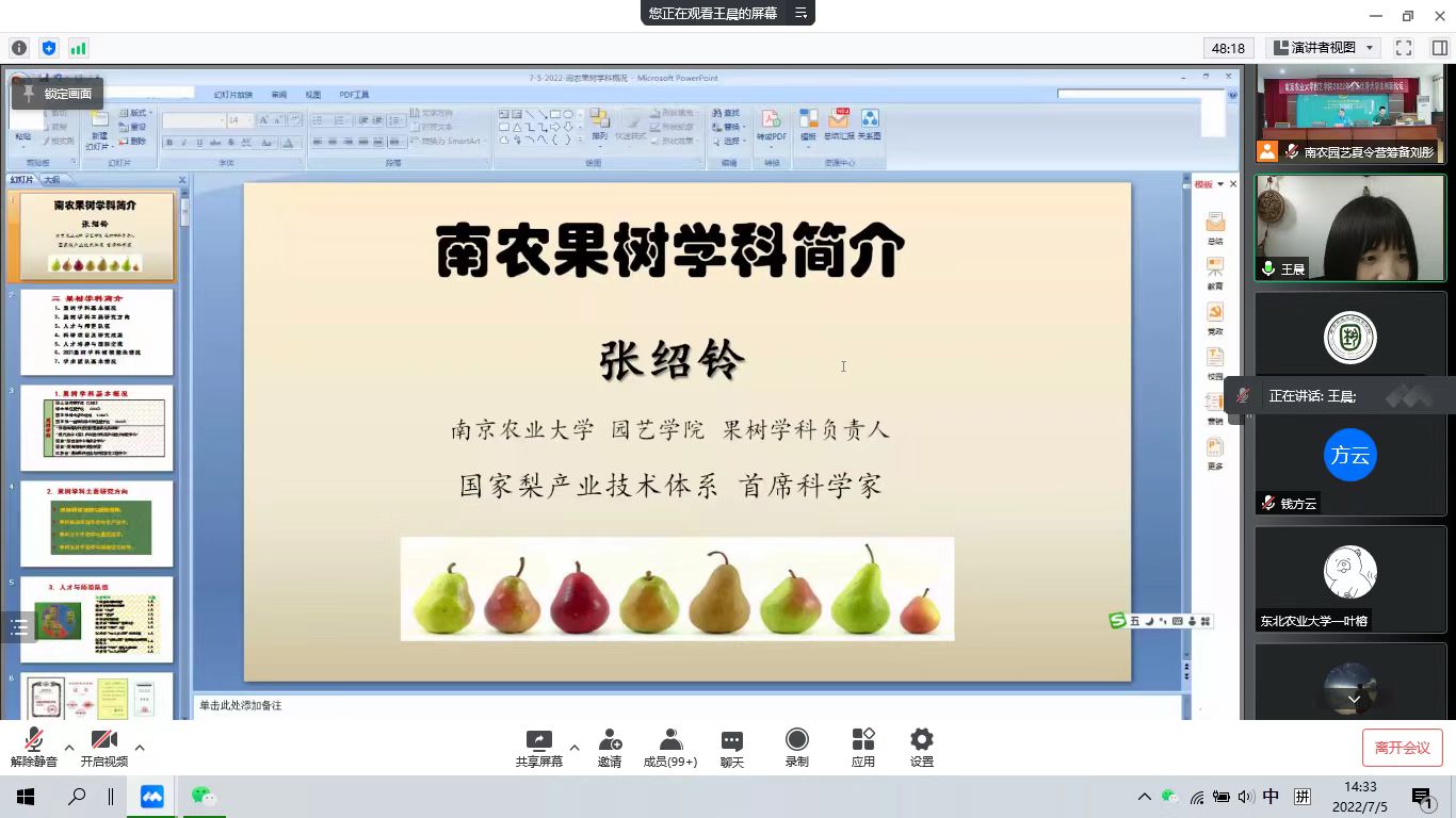 副院长、观赏园艺学科陈素梅教授、果树学科王晨教授、茶学学科房婉萍教授、设施园艺学科孙锦教授、风景园林学科丁绍刚教授。他们分别介绍了学科的师资、各位导师研究内容以及招生就业等情况,帮助学员们对各个学科有了更加深入的了解。