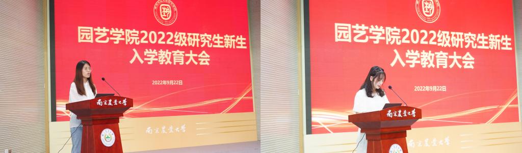 接下来,新老生代表分别发言。老生代表2019级博士徐素娟从科研学习和自身经历出发,鼓励新生要积极探索、敢于创新、劳逸结合、不断提升自身科研水平。新生代表2022级硕士周祉祺分享了自己本科在南农的丰富经历以及对未来研究生生活的向往,并表示希望能够和大家一起潜心学术,用扎实的理论知识武装自己,努力肩负起中华民族伟大复兴的历史重任。