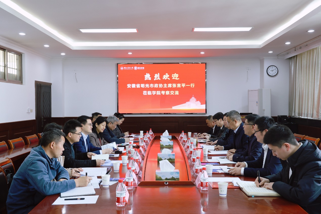 风和日丽,春意盎然。4月9日上午,安徽省明光市政协主席张言平带队来学院考察交流,洽谈合作。明光市委组织部副部长史卫明、农业农村局副局长卢正兵、明光街道党工委书记于文龙、桥头镇党委书记史立清、明光街道党工委组织委员李鑫鹏、明光街道重点项目办主任范军等陪同来访。学院党委书记韩健、院长陈素梅、副院长束胜及学科团队教师代表等参加交流座谈。会议由韩健主持。