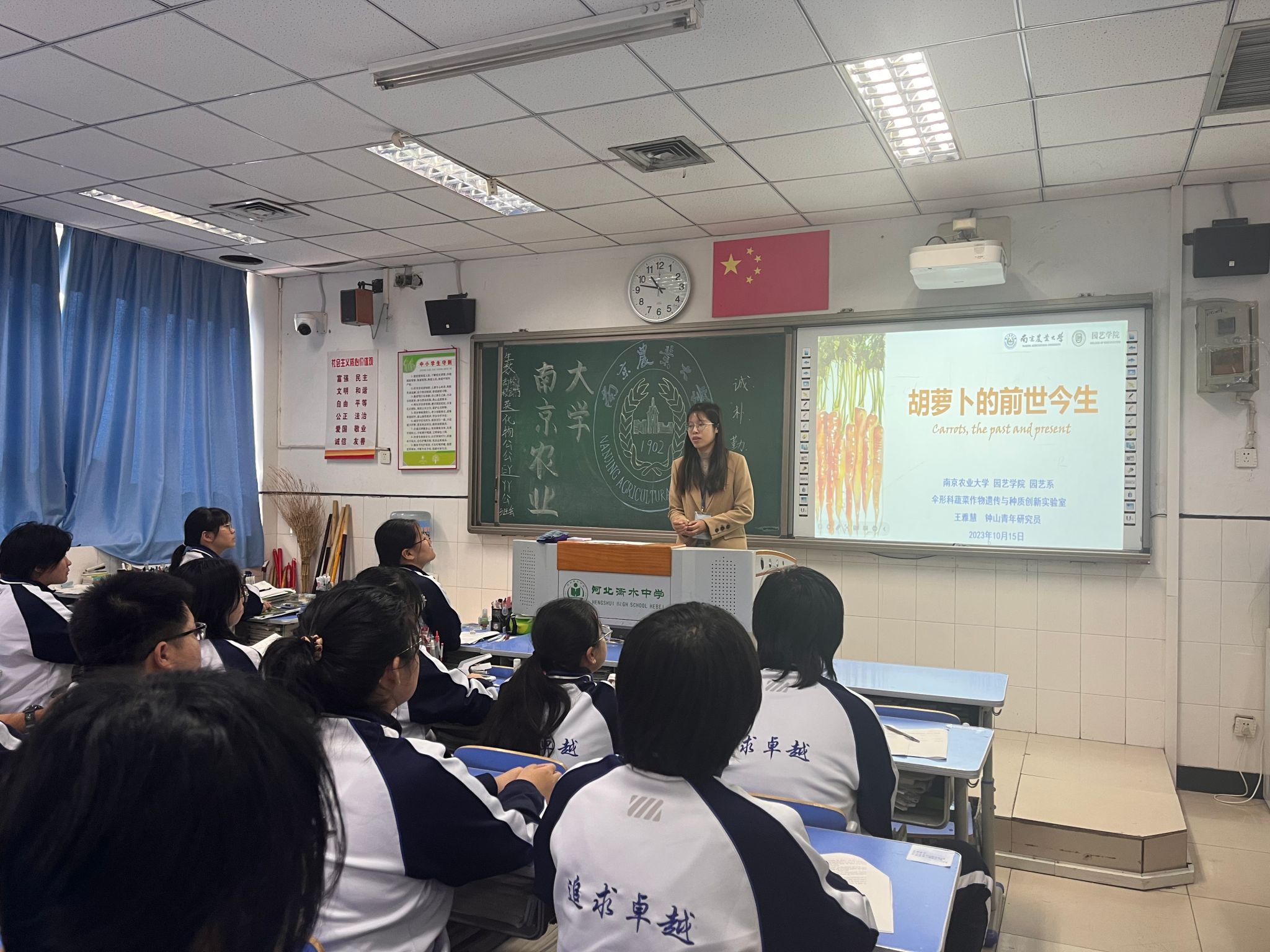 王雅慧博士为衡水实验中学和衡水中学的同学们开展胡萝卜的前世今生科普讲座。围绕胡萝卜的起源、驯化育种、营养成分等方面展开,向同学们介绍大学里的科研是什么样的,科学家们是如何发现问题、研究问题并为人类社会做出贡献的,现场互动热烈。