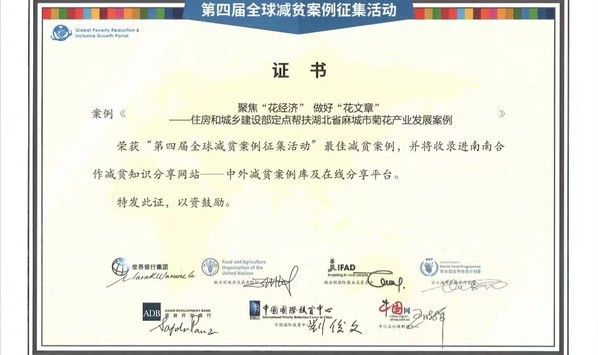 产业帮扶的《聚焦“花经济”做好“花文章”——住房和城乡建设部定点帮扶湖北省麻城市菊花产业发展案例》成功入选“第四届全球减贫案例征集活动”最佳减贫案例,并将收录进南南合作减贫知识分享网站——中外减贫案例库及在线分享平台。该案例是从全球32个国家征集了900多个原创优秀减贫和乡村发展案例中评审入选的最佳案例,将在全球范围内进行推广和分享,为世界各国关注减贫和乡村发展的组织及个人提供可参照的减贫模式和实施方案。