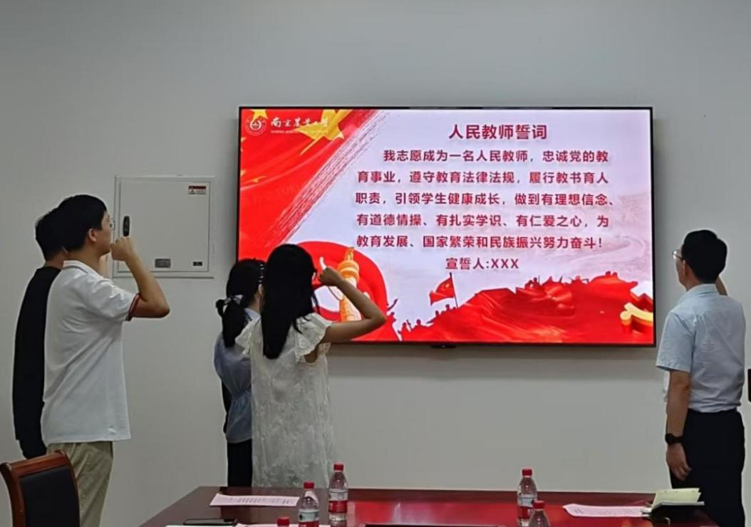 活动上,学院党委书记姚志友、院长陈素梅为从教四十周年的教师颁发“光荣从教四十载荣誉证书”,学院侯喜林、陈劲枫、吴震、陶建敏四位老教师作为代表为新教师佩戴校徽,党委书记姚志友带领新入职教师进行宣誓。
