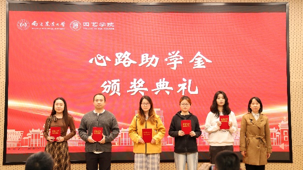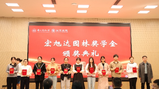 颁奖典礼上,参会嘉宾为获得缤纷助学金、心路助学金、百绿园林奖学金、厚德奖学金、宏旭达园林奖学金、坂田种苗企业奖学金、章镇奖学金的60余位学生逐一颁发荣誉证书。