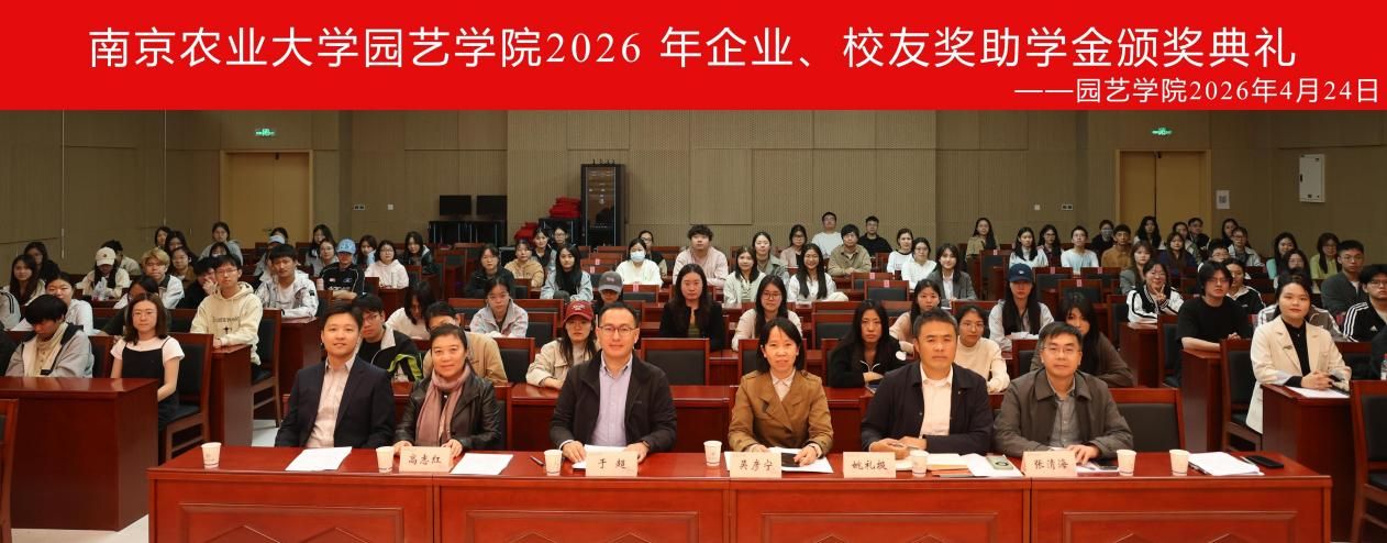 在滨江校区园艺楼142报告厅隆重举行2026年企业、校友奖助学金颁奖典礼。园艺专业2000级校友、江苏百绿园林集团有限公司副总经理、党支部书记姚礼报,设施科学与工程专业2008级校友、创想姜来(江苏)智慧科技有限公司总经理于超,学院党委书记吴彦宁,实验室与基地处副处长张清海,学院副院长王海滨、教授高志红出席典礼,全体获奖(助)学生及本研观礼学生代表参加活动。学院党委副书记束浩渊主持典礼。