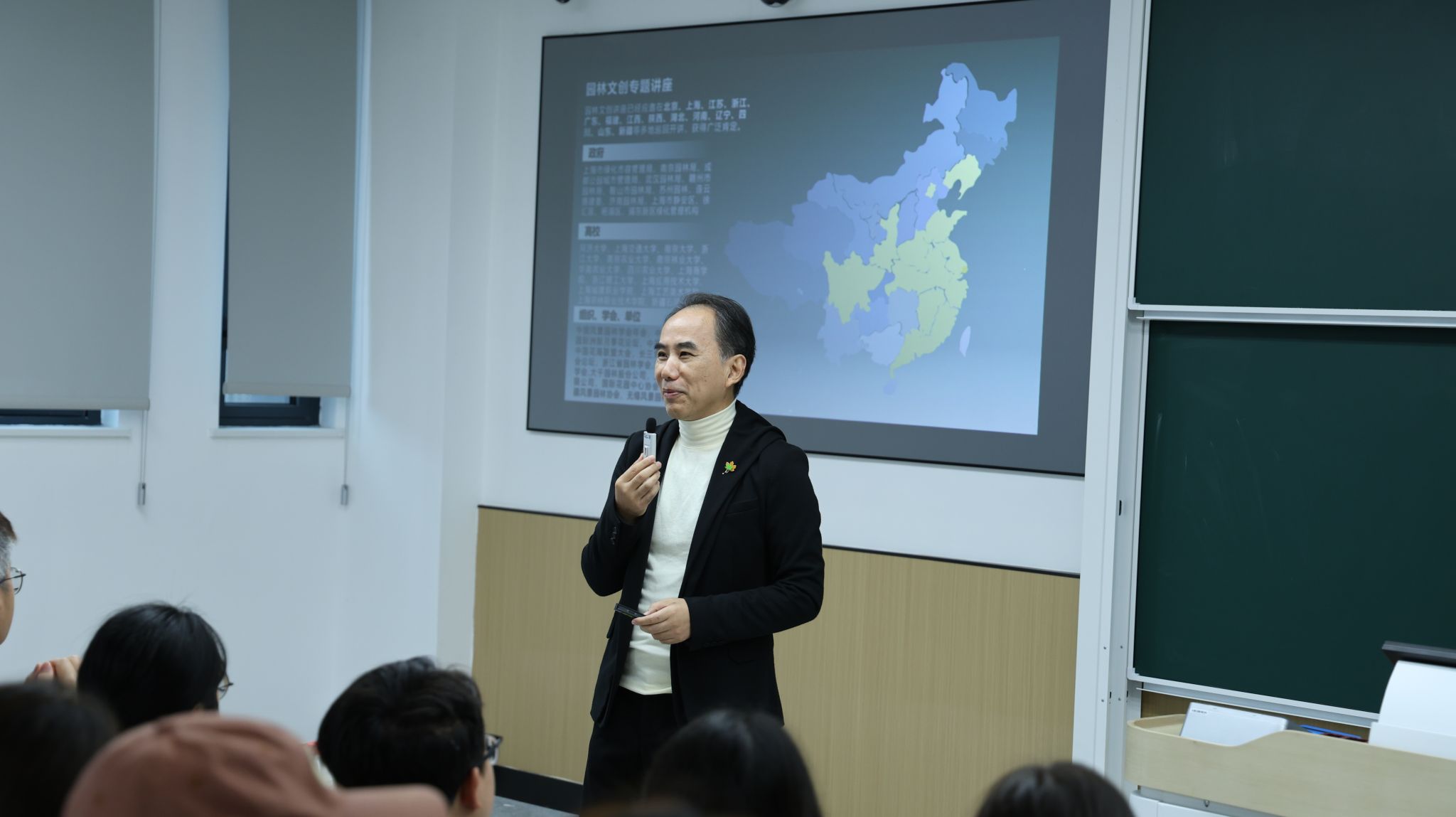 林小峰作题为《园林文创-新时代风景园林高质量发展的新质生产力及园林绿化企业转型发展的思考》专题讲座。他以当今园林传统领域发展境况为背景,分析当前园林行业发展困境,引出园林文创概念,并讲述国内外生产实际案例,分享自身从业心得体会,也为现阶段对行业发展、职业规划存在困惑的青年学生提供新视野,开拓新思路,点亮新希望。