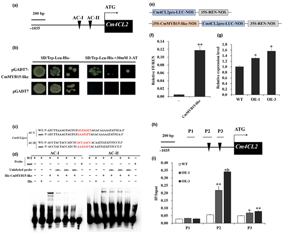 图1,CmMYB15-like直接结合Cm4CL2基因启动子区域并激活该基因表达