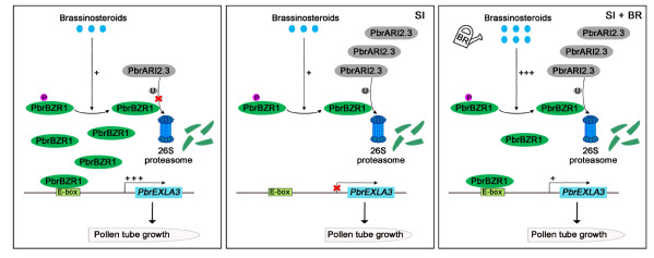 该研究发现,正常条件下,BR信号因子PbrBZR1转录激活细胞壁膨胀蛋白PbrEXLA3基因的表达从而促进花粉管的生长。在自交不亲和反应中,梨花粉高表达蛋白E3泛素连接酶PbrARI2.3累积,然后泛素化修饰PbrBZR1并通过26S蛋白酶体将其降解,从而抑制花粉管生长。外源施加BR诱导去磷酸化PbrBZR1蛋白累积,部分缓解了S-RNase对不亲和梨花粉管生长的抑制。总之,本研究揭示了BR翻译后修饰调控梨自交不亲和花粉管生长发育的分子机制。