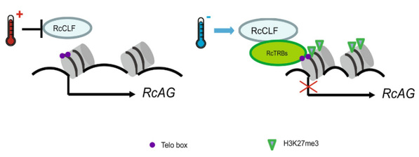 基于上述研究结果,论文提出了AGAMOUS内含子响应温度信号,调控月季花瓣数目的工作模型。AGAMOUS内含子通过Telo boxes响应低温信号,Telo boxes与CLF-TRB蛋白复合体结合,招募H3K27me3修饰,进而抑制了AGAMOUS表达,导致低温条件下月季花瓣数目的增多。