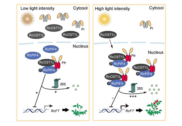 在本研究中发现月季在LL条件下比在HL条件下开花晚,这主要与RcOST1L介导的RcPIFs在不同光照条件下的稳定性有关。HL条件在RcPIFs降解之前触发其快速磷酸化。酵母双杂交筛选鉴定激酶RcOST1L与RcPIF4相互作用。在HL条件下,RcOST1L促进月季开花,并直接磷酸化RcPIF4的198位丝氨酸以促进其降解。光敏色素B(RcphyB)通过与活性phyB结合(APB)基序相互作用增强了RcOST1L介导的RcPIF4的磷酸化。RcphyB在HL条件下募集RcOST1L以促进其细胞核积累,进而导致RcPIF4的稳定性降低并加速开花。研究结果说明在不同光强下通过影响RcPIF4的稳定性调控月季开花的分子机制,从而揭示了RcOST1L在RcphyB-RcPIF4模块中调控开花的重要作用。