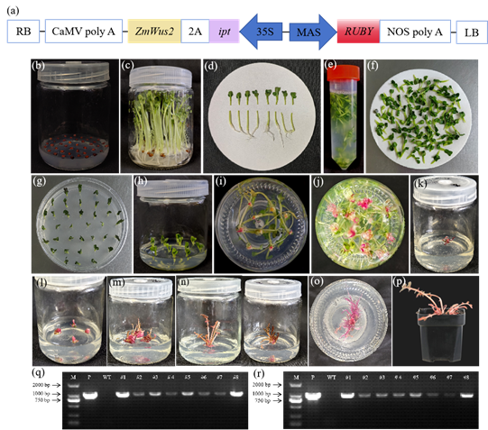 发育调节因子(Developmental Regulators, DRs)可以改变植物细胞发育命运,重新诱导分生组织形成,这种方式获得的分生组织在植物遗传转化应用上拥有巨大潜力。团队成员选取多个不同DRs因子组合进行萝卜再生诱导研究,发现Wus2-ipt组合可以促进愈伤组织形成,同时可在伤口部位直接诱导再生芽。综合利用Wus2-ipt组合、可视化报告基因RUBY、基于发根农杆菌介导的转化体系建立了萝卜简单、高效的遗传转化再生和基因编辑系统,再生芽诱导与生长无需添加任何外源激素,且利用早抽薹基因型获得转基因种子仅需6-7个月,成功打破萝卜遗传转化的技术瓶颈,可加快萝卜基因功能验证和种质创制进程,同时将为其它园艺作物的基因编辑和遗传改良提供重要参考与技术支撑。
